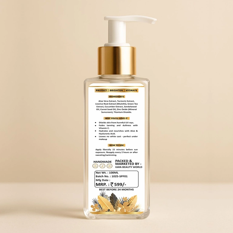 Aloe Vera Extract ,Turmeric Extract, Licorice Root Extract (Mulethi), Green Tea Extract, Cucumber Extract, Sandalwood Oil, Carrot Seed Oil , Zinc Oxide (Mineral Sunscreen), Titanium Dioxide.
